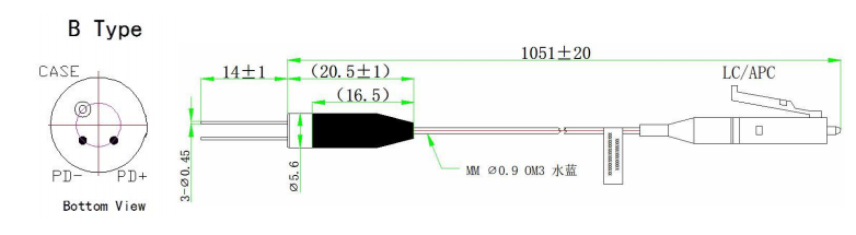 InGaAs Pigtailed Photodiodes көпмодалы талшықты біріктірді, өзегі диаметрі 50 мкм немесе 62,5 мкм таңдауға болады және анықтау толқын ұзындығы 900-1700 нм.
