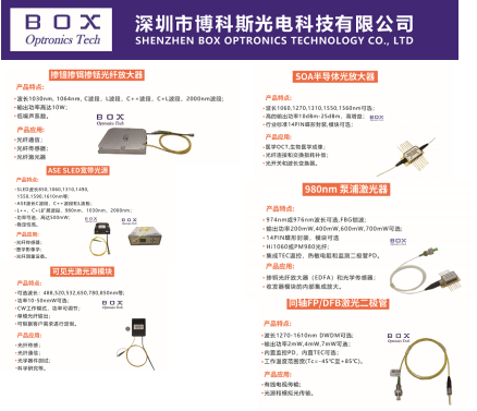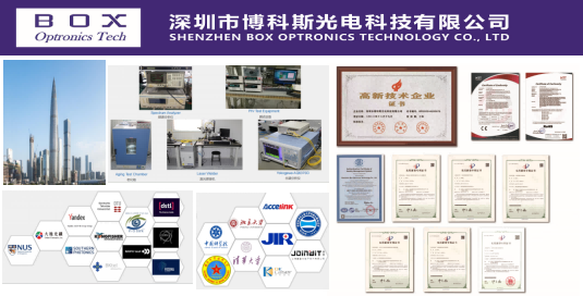 Shenzhen Box Optronics Technology Co., Ltd.(Қорапта Optronics Tech) - бұл талшықты-оптикалық байланыс және талшықты-оптикалық сезімге мамандандырылған жоғары технологиялық кәсіпорын. Компания клиенттерге жоғары сапалы өнімдер мен қызметтерді ұсынуға, сервистік жауап беру уақытын және клиенттерге үлкен мән бере алады. Күшті ғылыми-зерттеу, өндіріс және сату мүмкіндіктері, сонымен қатар өнімді дамытудың тәжірибелі инженерлері, сонымен қатар компания клиенттердің әр түрлі қажеттіліктеріне сәйкес жекелендірілген өнімді бейімдеуі мүмкін. Көптеген жылдар бойы компания технологиялық инновацияға, үздіксіз технологиялар мен таланттарды үнемі енгізуге ұмтылды. Ол AAA деңгейіндегі несие кәсіпорны, технологиялық шағын және орта технологиялық кәсіпорынның сертификаттарын алды және жоғары технологиялық ұлттық сертификаттар алды және ISO9001 сапа жүйесін сертификаттады, бұл жүйелік талаптарды және өнімнің сапасын қатаң түрде ұстады.